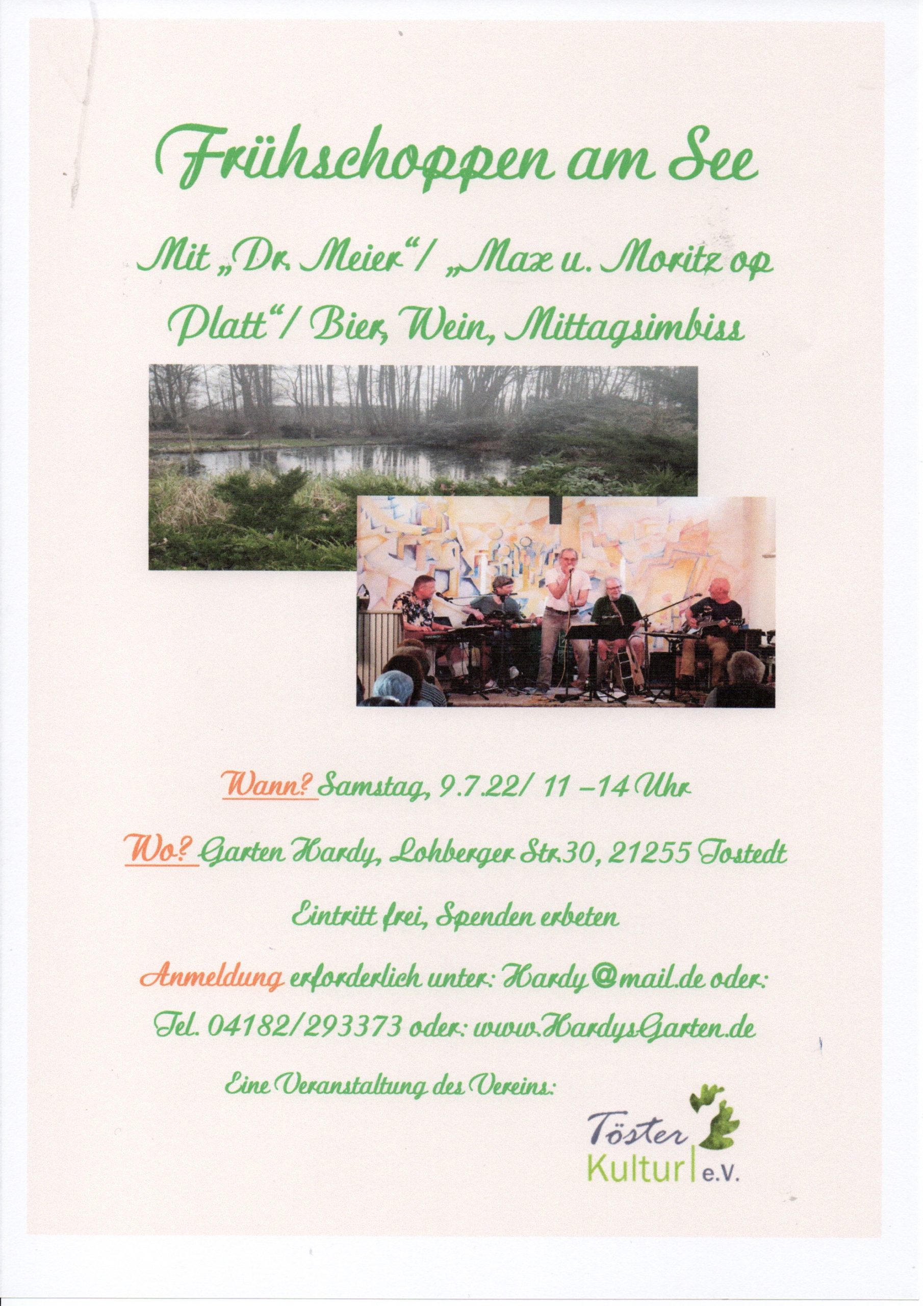 Im Namen unseres Vereins TösterKultur e.V. laden die Hardys zu einem Frühschoppen am See ein. Am Samstag, den 9. Juli von 11 bis 14 Uhr gibt es hoffentlich eine weitestgehend coronafreie Sause mit der Jazzband “Dr. Meier” und eine Aufführung von “Max und Moritz op Platt” bei Mittagsimbiss, Bier und Wein (und Wasser). Der Eintritt ist frei, Spenden sind jedoch möglich. Da der Frühschoppen bei den Hardys im Garten stattfindet, sind Anmeldungen über: Hardy@mail.de oder Tel. 04182/293373 oder über die Website www.hardysgarten.de erforderlich! Ihr findet den tollen Garten der Hardys in der Lohberger Str. 30 in 21255 Tostedt. Wir freuen uns auf Euch und danken jetzt schon den Hardys für dieses tolle Engagement. Über den QR-Code könnt Ihr direkt per Paypal spenden.