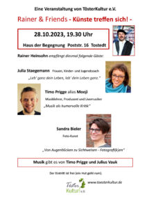 Unsere erfolgreiche Talkserie “Rainer&Friends” nimmt Kurs auf die 4. Veranstaltung. Thematisch und musikalisch steht wieder ein Höhepunkt der Talkrunde ins Haus. Also, kommt zahlreich, es lohnt sich und es hat diese besondere Atmosphäre, die Fernsehtalkshows langweilig und uninspiriert erscheinen lassen.