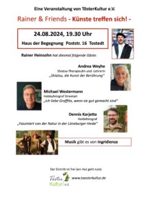 Die Interviews mit seinen Gästen brachten interessante Einblicke in persönliche Zugänge zur Kunst und Fotografie im städtischen und im Heideraum, aber auch Hintergründe zur Traditionellen Chinesischen Medizin bis hin zu der in Japan entwickelten Form des Shiatsu. Man darf gespannt sein, wie es Rainer weiterhin schafft, so viele interessante Gäste zu präsentieren. Fotos: H. Kalinowsky (Rainer mit Michael Westermann, Andrea Weyhe, Dennis Karjetta und Ingridienza)