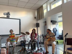 Am Samstag, den 24. August, gab es eine weitere Folge des Kunst- und Kulturtalks mit Rainer Heinsohn. Rainer präsentierte nicht nur ein neues Lied mit seiner Band Ingridienza, Heart of Valentine, sondern auch einen Überraschungsgast, eine junge ukrainische Malerin, Alevtyna Neskoromova, die schon als Siebzehnjährige 2023 einen internationalen Preis mit dem Bild “Kiewer Frühling” gewann. Im Haus der Begegnung wurden auch weitere Bilder von ihr präsentiert. Foto:H.Kalinowsky