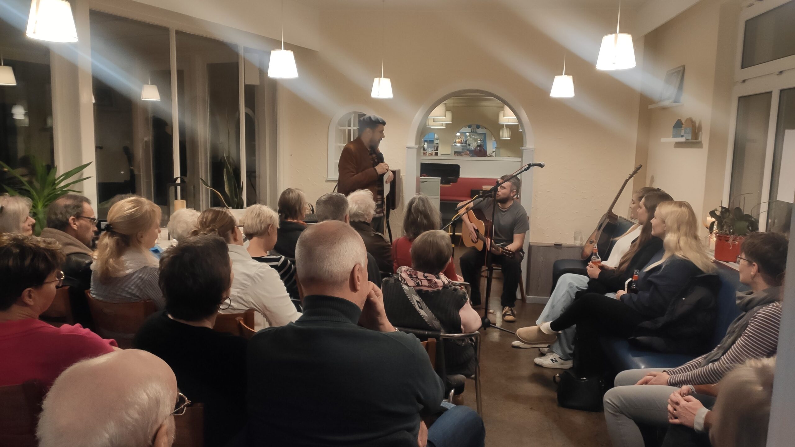 Geladen wurde zu einem Musik-Special mit den Singer-Songwriter:innen Anna „Änna“ Wentzien und Timo Prigge aka „Mooji“. Timo konnte durch Rainer den Gästen detaillierte Einblicke in sein breites musikalisches Betätigungs- und Schaffensfeld als Musiklehrer, Musikproduzent, Straßen- und Livemusiker geben. Timo hatte zu seiner Unterstützung bei zwei Songs die Geigerin Helena Barz als Überraschungsgästin mitgebracht und spannte einen großen Bogen zwischen englischen Songs mit Textinhalten, die, wie Rainer anmerkte,“ … aus seinem inneren Selbst stammen, bis hin zu Liedern mit deutschen Texten, deren Inspirationen dazu in der medialen Umgebung von Timo liegen und die diese auf humorvolle Art und Weise kritisch in den Songfokus nehmen“. Besonders der Song mit dem Titel „Gerät“ wurde von großem Gelächter auf Seiten des Publikums begleitet und erwies sich als ein echter „Hit“. Trotz neuer Location hielt Moderator Rainer an seinem Pausenkonzept fest, damit das Publikum mit sichtlicher Freude den Austausch untereinander pflegen konnte.