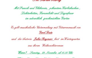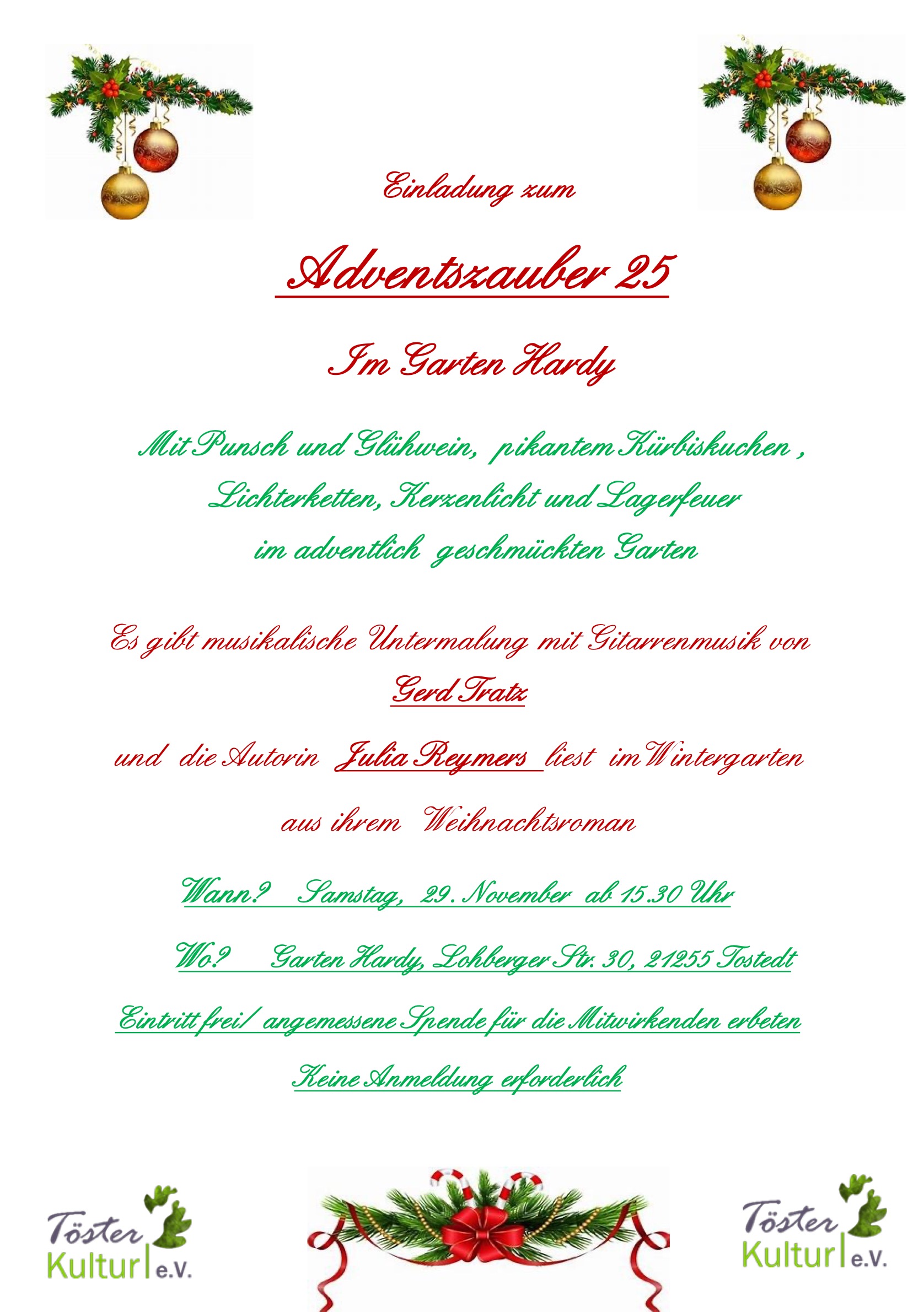 Wie schön, dass bei uns Gigi und Horst Hardy mit ihrem wunderbar verzaubernden Garten kulturell aktiv sind. Auch in diesem Jahr bieten sie zur Vorweihnachtszeit etwas Besonderes: Adventszauber Garten Hardy
